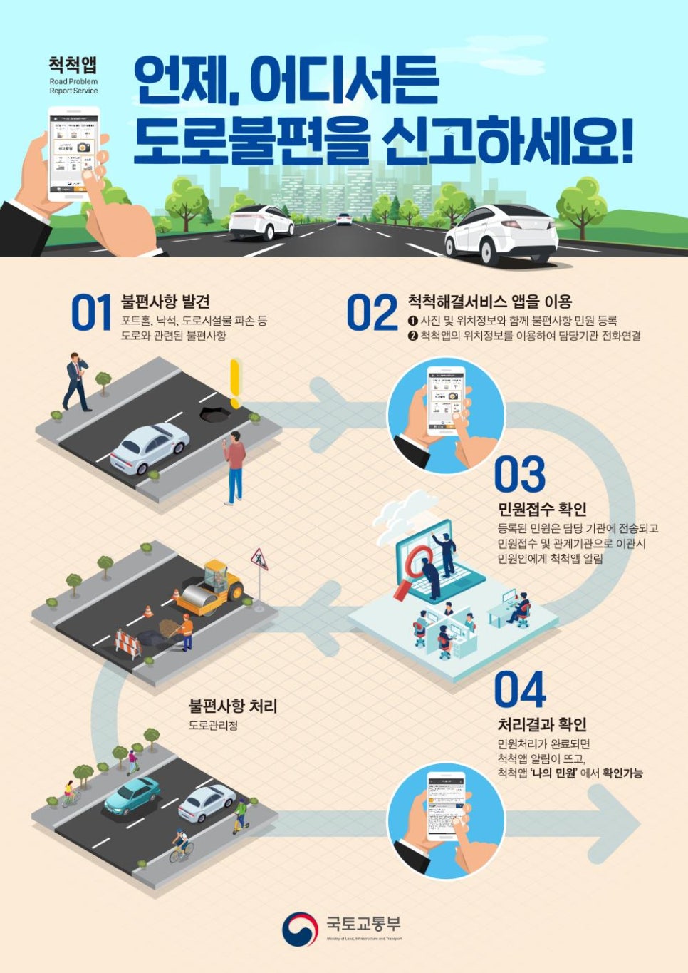 - 낙하물, 도로파임, 배수불량, 교통사고 위험 등 다양한 위험 요소를 척척앱으로 신고 가능
